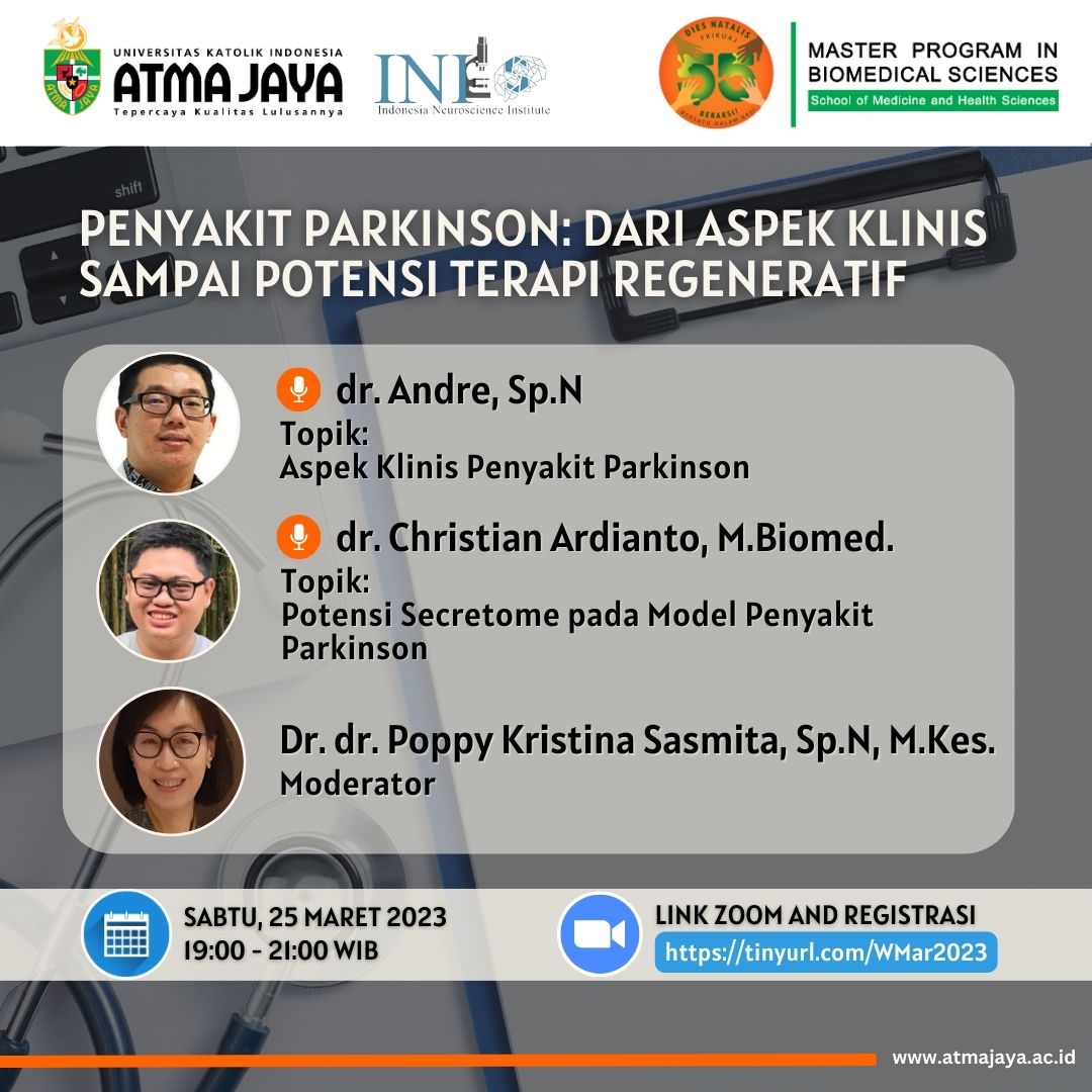 Program Studi Magister Biomedik Fakultas Kedokteran dan Ilmu Kesehatan, Universitas Katolik Indonesia Atma Jaya, bekerja sama dengan Indonesia Neuroscience Institute (INI) akan menyelenggarakan webinar dengan topik Penyakit Parkinson: dari Aspek Klinis sampai Potensi Terapi Regeneratif pada Sabtu, 25 Maret 2023 pukul 19:00 – 21.00 WIB.