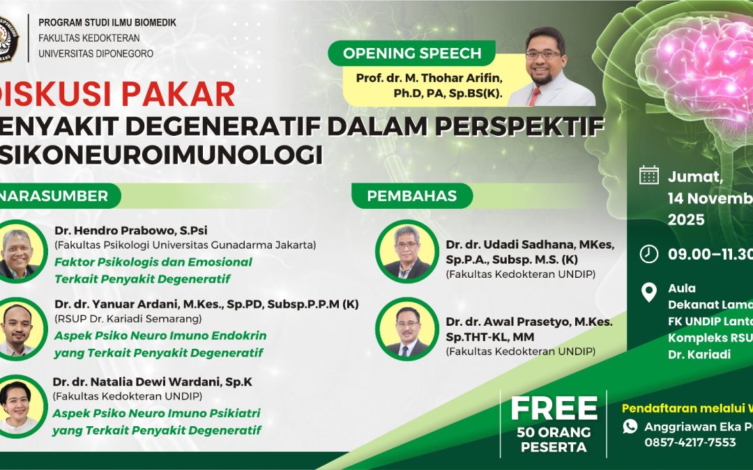 Program Studi Magister Ilmu Biomedik Fakultas Kedokteran Universitas Diponegoro (FK UNDIP) menyelenggarakan Kuliah Tamu dan Diskusi Pakar bertema “Penyakit Degeneratif dalam Perspektif Psikoneuroimunologi (PNI)” pada Jumat, 14 November 2025. Kegiatan ini digelar di Aula Dekanat Lama FK UNDIP, Semarang, dan menghadirkan para pakar dari bidang psikologi, penyakit dalam, dan psikiatri.